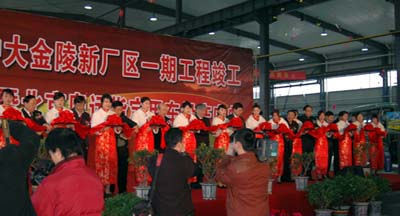 剪裁儀式上,李仁、董建平、朱瀅、顧堯天、魏然、王德超、孔慶輝、張樂夫等十八位領(lǐng)導(dǎo)為中大金陵新廠區(qū)一期工程竣工暨08年北京奧運(yùn)用車投產(chǎn)慶剪裁。