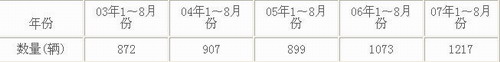 由上表我們可以看出:從03年1~8月到05年1~8月,價格在90萬以上的客車銷量一直未突破1000輛,06年1~8月銷量突破1000輛達到了1073輛,07年1~8月銷量達到1217輛。
