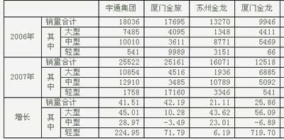 目前,在客車行業(yè)“一通三龍”的龍頭地位已經(jīng)得到普遍認(rèn)可。從銷量數(shù)據(jù)的對比來看,“一通三龍”不僅在銷量上領(lǐng)先,在增長速度上也遠(yuǎn)遠(yuǎn)高于行業(yè)的平均水平,如下表所示,2007年,“一通三龍”的同比增幅為34.48%,超出行業(yè)平均水平一倍多,四家企業(yè)的行業(yè)集中度達(dá)到了47.29%,同比增加了5.35個百分點,我們將這種現(xiàn)象稱為強(qiáng)者愈強(qiáng)。