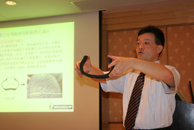 在這次米其林輪胎安全知識(shí)培訓(xùn)營(yíng)活動(dòng)上,米其林的專(zhuān)家對(duì)輪胎的結(jié)構(gòu)常識(shí)、使用與保養(yǎng)、輪胎常見(jiàn)故障的鑒別等內(nèi)容作了詳細(xì)介紹,例如:輪胎充氣氣壓不足或過(guò)高都會(huì)加快輪胎的磨損;不正確地裝拆輪胎也會(huì)導(dǎo)致胎圈損壞、胎邊鼓包的問(wèn)題,導(dǎo)致輪胎隱患。另外,米其林專(zhuān)家還重點(diǎn)分析了常見(jiàn)的爆胎和鼓包問(wèn)題。其實(shí),爆胎原因有很多,但最常見(jiàn)的就是由于輪胎被割破或撞擊導(dǎo)致輪胎快速漏氣;或者由于胎面扎釘、扎釘后不良修補(bǔ)、氣門(mén)芯密封不嚴(yán)等問(wèn)題導(dǎo)致輪胎慢性漏氣,使輪胎缺氣行駛碾壞胎體最終導(dǎo)致爆胎。而常見(jiàn)的輪胎鼓包則是由于胎邊受到猛烈撞擊引起。無(wú)論是不正常磨損、鼓包還是爆胎,都對(duì)行車(chē)安全構(gòu)成了極大威脅。因此而正確認(rèn)識(shí)輪胎,經(jīng)常檢測(cè)胎壓和選擇專(zhuān)業(yè)的輪胎產(chǎn)品和輪胎服務(wù)是降低行車(chē)中事故隱患的有效途徑。針對(duì)節(jié)假日自駕游,米其林專(zhuān)家還專(zhuān)門(mén)介紹了輪胎使用的各種誤區(qū),例如胎壓過(guò)高、高溫下放氣降壓、一味追求寬胎等等,更好地指導(dǎo)了駕車(chē)人節(jié)假日出行。