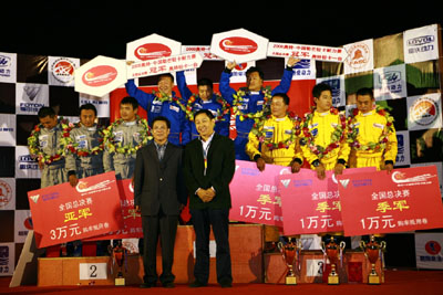 賽場(chǎng)周圍還有設(shè)施齊備的餐飲、娛樂(lè)和休閑場(chǎng)所,主辦方為到場(chǎng)的觀眾提供了免費(fèi)午餐和豐厚的獎(jiǎng)品,并組織了很多汽車娛樂(lè)活動(dòng),讓車迷們?cè)谶@里如同過(guò)節(jié)一樣。觀眾可以一邊吃著可口的食物,一邊觀看賽車在賽道上飛馳,這可以堪稱賽車界里獨(dú)一無(wú)二的情景。十一日下午六點(diǎn)整,激動(dòng)人心的最后時(shí)刻即將到來(lái)。10-9-8-7….隨著最后讀秒時(shí)刻的來(lái)臨,全體觀眾也情不自禁起立共同站立,迎接冠軍車撞線的那一激動(dòng)瞬間。最終來(lái)自云內(nèi)動(dòng)力賽車俱樂(lè)部的6號(hào)車隊(duì)以優(yōu)異成績(jī)獲得冠軍,雷沃動(dòng)力賽車俱樂(lè)部的5號(hào)車隊(duì)以不俗成績(jī)屈居亞軍,而揚(yáng)柴動(dòng)力賽車俱樂(lè)部12號(hào)車隊(duì)獲得季軍。在熱烈的掌聲中,中國(guó)汽車運(yùn)動(dòng)聯(lián)合會(huì)、江蘇省汽車摩托車運(yùn)動(dòng)聯(lián)合會(huì)、福田汽車領(lǐng)導(dǎo)為獲獎(jiǎng)車手頒發(fā)了證書(shū)和獎(jiǎng)品, 歡呼、掌聲、擁抱、舉杯,現(xiàn)場(chǎng)成了歡樂(lè)的海洋。