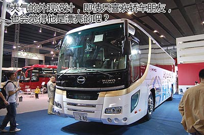 在本次廣州車展的商用車展臺(tái)上面,有一款由HION在日本本土推出的selega系列的大型巴士,該車基本上是HION到目前為止發(fā)展的最好的幾部大型巴士之一了,在車身的設(shè)計(jì)上面大量的采用了立體的線條造型,在不縮減車內(nèi)空間的同時(shí)把車身凹凸的線條表現(xiàn)的淋漓盡致。盡管我們沒有機(jī)會(huì)等上巴士內(nèi)部深入的了解,但憑借一貫日系對(duì)大型車的設(shè)計(jì)理念,豪華程度絕對(duì)不會(huì)亞于一般轎車。