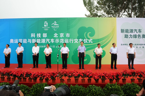 2008年7月11日10點30分,奧運節(jié)能與新能源汽車示范運行交車儀式在北京奧體南區(qū)5號公交場站如期舉行。中央政治局委員、北京市委書記、北京奧組委主席劉淇,全國政協(xié)副主席、致公黨中央主席、國家科技部部長、奧運科技(2008)行動計劃領(lǐng)導(dǎo)小組組長萬鋼,北京市委副書記、北京市市長郭金龍,中國科學(xué)院院士徐冠華等相關(guān)領(lǐng)導(dǎo)、專家出席了交車儀式。同時,國家科技部、北京市有關(guān)部門、北京奧組委、節(jié)能與新能源汽車研發(fā)單位、生產(chǎn)企業(yè)、運營單位、地方政府部門代表400余人參加了交車儀式。