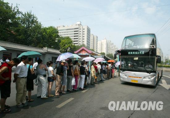上午9點(diǎn)記者來(lái)到北官?gòu)d公交停車場(chǎng),等候體驗(yàn)觀光線路的市民隊(duì)伍一直排到車場(chǎng)的出口,工作人員在組織市民有序乘車,觀光專線票價(jià)暫定3元,單一票制,公交一卡通有效但不享受折扣,車輛全部采用亞星-6130雙層空調(diào)巴士,這是北京首批雙層空調(diào)公交車,高4米,每層層高都是1.75米,第2層比目前的雙層公交車的2層高出10到15厘米;車長(zhǎng)13米,比一般雙層車長(zhǎng)出1米。每輛車有58個(gè)乘客座位,其中上層40座,下層18座,全部都是按照航空座位標(biāo)準(zhǔn)設(shè)計(jì)制造。