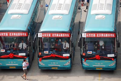 山東交通奧運(yùn)車隊(duì)由山東交運(yùn)集團(tuán)統(tǒng)一購置的70部高一級以上大客車組成,車輛尾氣排放標(biāo)準(zhǔn)、服務(wù)設(shè)施配置全部達(dá)到北京奧組委要求。經(jīng)過層層政審和選拔,山東交運(yùn)集團(tuán)從內(nèi)部駕駛員隊(duì)伍中擇優(yōu)選拔85名技術(shù)過硬、身體健康、綜合素質(zhì)高的駕駛員,其中75名直接赴京參加奧運(yùn)交通保障服務(wù),10名作為機(jī)動(dòng)隊(duì)員在濟(jì)南待命。