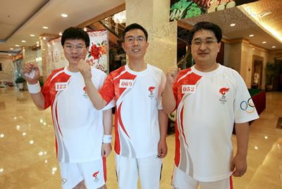 7月25日起,北京奧運圣火將在河南省進行傳遞,屆時,將經(jīng)歷鄭州、開封、洛陽及安陽等城市。奧運官網(wǎng)記者親赴河南,獨家采訪眾多河南火炬手。圖為來自于宇通客車的三名火炬手握緊拳頭為奧運加油。