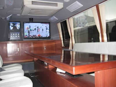 車內(nèi)空間寬敞,裝修精美, 可容納十幾人開會和現(xiàn)場辦公