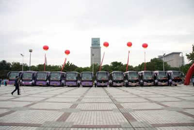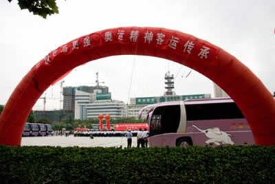 2008年7月5日上午,細(xì)雨飄飄的鄭州綠城廣場(chǎng)彩旗飄揚(yáng)、鑼鼓喧天,熱鬧非凡, 30臺(tái)嶄新的宇通客車(chē)整齊地分兩排停在廣場(chǎng)上。鄭州交運(yùn)集團(tuán)的首批奧運(yùn)服務(wù)用車(chē)發(fā)車(chē)儀式正在這里舉行,鄭州市常務(wù)副市長(zhǎng)穆為民、河南省交通廳副廳長(zhǎng)李和平和鄭州交運(yùn)集團(tuán)的有關(guān)領(lǐng)導(dǎo)出席了首發(fā)儀式。