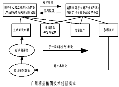 精益集團(tuán)的技術(shù)創(chuàng)新模式兼具技術(shù)推動(dòng)模式與市場(chǎng)需求拉動(dòng)模式的特征。精益集團(tuán)技術(shù)中心在技術(shù)創(chuàng)新過(guò)程中所扮演的“公司孵化器”與“技術(shù)、產(chǎn)品孵化器”的雙重角色就決定了技術(shù)中心的研發(fā)過(guò)程本身具有創(chuàng)新的色彩,也就是說(shuō),精益集團(tuán)通過(guò)對(duì)技術(shù)中心進(jìn)行不同于一般研究機(jī)構(gòu)的市場(chǎng)化管理,即進(jìn)行一系列的制度創(chuàng)新,使企業(yè)的技術(shù)創(chuàng)新行為更為有效,并且在機(jī)制上維持了對(duì)技術(shù)創(chuàng)新的不懈追求的內(nèi)部欲望。
