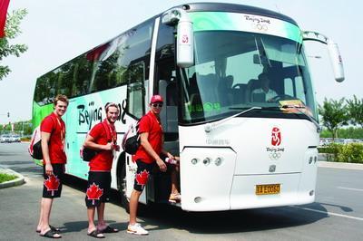 加拿大運動員正準備乘坐一輛中國純電動客車,前往就餐地點。