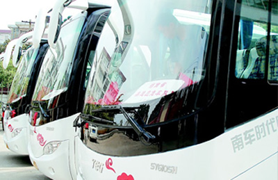 國(guó)家交通運(yùn)輸部此次共抽調(diào)了21個(gè)省的836輛客運(yùn)車開展奧運(yùn)通勤服務(wù)。株洲湘運(yùn)集團(tuán)調(diào)集了5輛由南車時(shí)代集團(tuán)生產(chǎn)的大巴開赴北京,除此次出發(fā)的3輛外,另兩輛大巴將作為應(yīng)急車隨時(shí)聽候調(diào)遣。這5輛大巴車身以白色為主色,兩側(cè)有紅色祥云圖案裝飾,車身上書寫著“湖南人民為北京加油”字樣。大巴以柴油為動(dòng)力,可搭乘45名乘客。