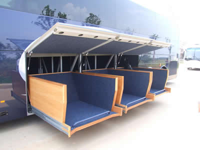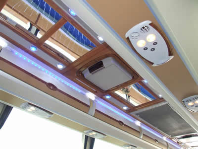 該車行李艙內(nèi)安裝3個手動滑輪式高爾夫球包架,為乘客提供巨大方便。行李艙的后尾頂部還安裝了柴油發(fā)電機,除了可以供應(yīng)廚房用電之外,還可以進行外接,方便乘客攜帶的手機等所需充電設(shè)備的使用。車子前方還安裝了攝像頭,并與室內(nèi)電視連接,讓乘客在欣賞兩邊風景的同時,還可以領(lǐng)略前方的精彩。車內(nèi)采用航空行李架,并配以服務(wù)按鈕,集安全便捷與一體。駕駛員操作區(qū)增加了鼓風系統(tǒng),為駕駛員提供了冷氣保障,保證車內(nèi)溫度的一致性。蝶式衛(wèi)星天線的安裝,讓電視節(jié)目的接收不受地形、位置的限制,同時保證無線網(wǎng)絡(luò)的有效利用。車內(nèi)盡頭是現(xiàn)代化的廚房及衛(wèi)生間,咖啡機、飲水機、微波爐、冰箱及高檔櫥柜,為乘客的旅途及休息提供便利。