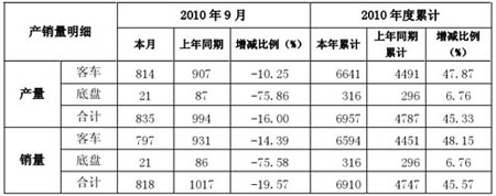 安凱2010年前9月生產(chǎn)客車6641輛,同比增47.87%;累計(jì)銷售客車6594輛,同比增48.15%。其中,公司9月份生產(chǎn)客車814輛,同比下降10.25%;銷售客車797輛,同比下降14.39%。