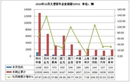 2010年10月客車生產(chǎn)29658輛,累計生產(chǎn)285871 輛,銷售26707輛,累計銷售288941輛,同比累計增長分別為31.15 %和33.57 %。