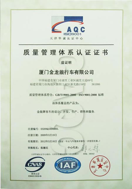 2009年3月,擁有國內(nèi)最專業(yè)的汽車產(chǎn)品認(rèn)證審核的中國汽車產(chǎn)品認(rèn)證中心(即天津華誠認(rèn)證中心)的專家組們,來到廈門金旅公司對其進(jìn)行ISO9001質(zhì)量管理體系的再認(rèn)證審核。在一道道嚴(yán)格的審核后,廈門金旅榮獲了新的質(zhì)量管理體系認(rèn)證證書。