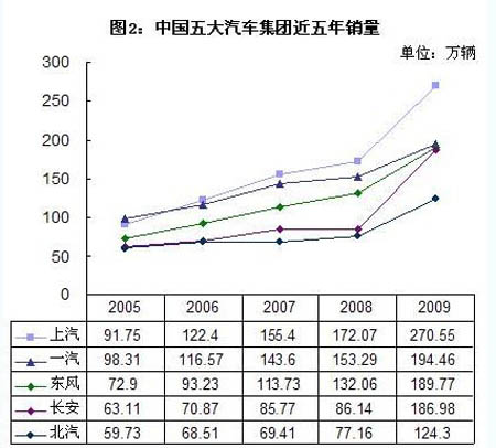 2005-2009年,中國(guó)五大汽車集團(tuán)的總銷量分別為385.80萬輛、471.58萬輛、567.91萬輛、620.72萬輛、966.06萬輛(見圖1),可以說抵得上眾多國(guó)家的汽車銷量之和。