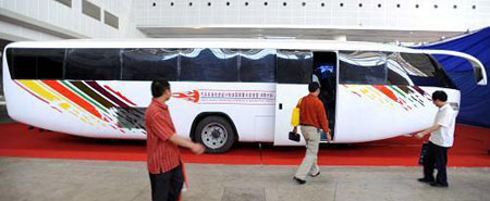 5月21日,觀眾在參觀菱形客車。在當(dāng)日開幕的“2009湖南汽車展覽會(huì)”上,由湖南大學(xué)和湖南同心實(shí)業(yè)股份有限公司自主研發(fā)制造的菱形客車成為一大亮點(diǎn)。據(jù)工作人員介紹,這款菱形客車采用柴油動(dòng)力,底盤呈菱形,車輪呈菱形分布,具備阻力小、轉(zhuǎn)彎半徑小、安全性高等特點(diǎn)。