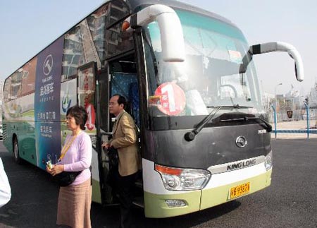 與會(huì)嘉賓乘坐金龍客車抵達(dá)世博園區(qū)