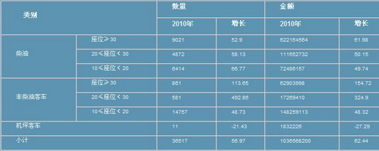 2010年,我國10座以上客車共出口36517輛,同比增長56.97%。出口金額10.36億美圓,同比增長62.44%?蛙嚦隹趩蝺r為28385美元。約合人民幣19萬元。