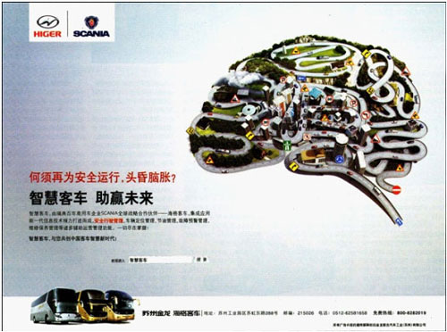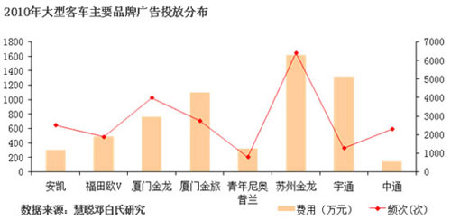 2010年,大型客車(chē)主要品牌宇通、安凱、蘇州金龍、廈門(mén)金龍、廈門(mén)金旅、福田歐v、中通、青年尼奧普蘭等在平面媒體和網(wǎng)絡(luò)媒體的廣告投放規(guī)模迥異,“一通三龍”仍是廣告投放大戶,規(guī)模明顯居前。廣告訴求上,鄭州宇通堅(jiān)持“節(jié)油典范”、“每個(gè)座位上坐著的都不只一個(gè)人”、“安全防衛(wèi)首當(dāng)其沖”等節(jié)能、安全訴求;安凱專(zhuān)注 “安全之道”品牌理念;蘇州金龍 “智慧客車(chē)”的“智能交通”宣傳突出;廈門(mén)金旅以尊榮、誠(chéng)信、共贏、卓越等關(guān)鍵字眼,推崇誠(chéng)信理念;廈門(mén)金龍強(qiáng)調(diào)車(chē)廂空間優(yōu)勢(shì),以“中國(guó)創(chuàng)造暢行全球”、“更多座位為您創(chuàng)造更高票房”等訴求拓展市場(chǎng),并推動(dòng)“2010年全國(guó)巡展”。