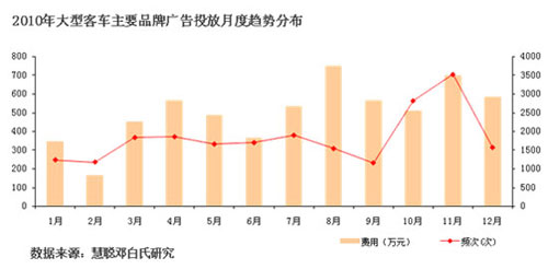 監(jiān)測(cè)顯示,2010年,大型客車(chē)主要品牌宇通、安凱、蘇州金龍、廈門(mén)金龍、廈門(mén)金旅、福田歐v、中通、青年尼奧普蘭等在平面媒體和網(wǎng)絡(luò)媒體的廣告總投放額達(dá)到6017.66萬(wàn)元,廣告頻次為21901次。從月度走勢(shì)來(lái)看,眾品牌整體廣告投放下半年呈現(xiàn)強(qiáng)勢(shì),“金九銀十”前后的市場(chǎng)廣告預(yù)熱仍是廣告投放重點(diǎn)時(shí)段,8月和11月份形成明顯高峰。