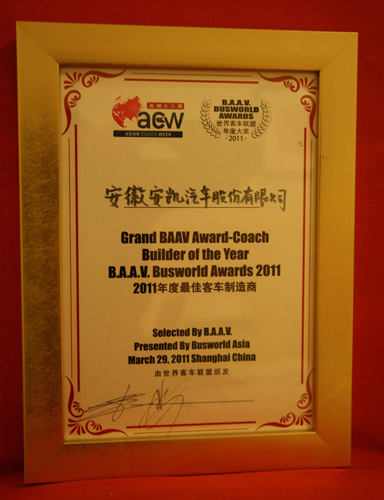 3月29日晚,2011(第十一屆)世界客車博覽亞洲展覽會(Busworld Asia 2011)同期評獎活動——ACW亞洲客車周BAAV大獎在上海汽車會展中心隆重揭曉,吸引了國內(nèi)外眾多著名客車業(yè)巨頭參展并角逐展會的眾多獎項,在這次展會上,安凱客車憑借著自身優(yōu)勢成功摘得最具分量的“2011BAAV年度最佳客車制造商”大獎。