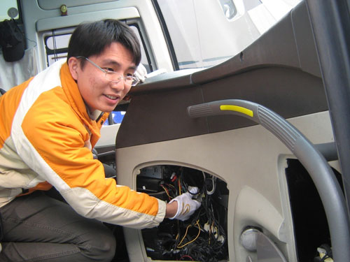 大金龍售后服務工程師朱培榮正在檢查車輛電器系統