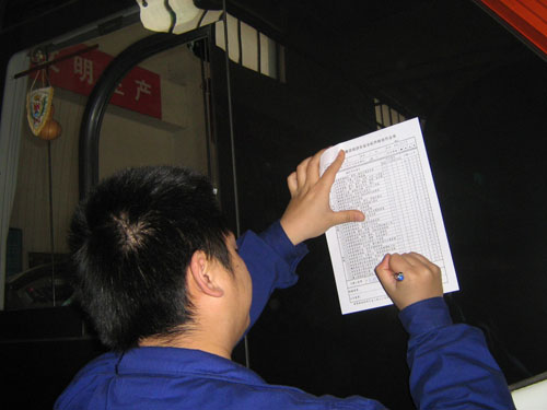 上會期間,朱培榮和同事們堅持“細之又細”的服務原則,每天早上五點多起床趕赴各個駐點,與車隊隊長和駕駛員進行常規(guī)的行前溝通檢查,并全天24小時隨時待命。每晚收車后還要對車輛進行檢修,對照安全機件檢查作業(yè)單(以下簡稱“檢查作業(yè)單”),對車輛設施、發(fā)動機、電器、底盤四大項33小項進行逐一檢查,每張檢查作業(yè)單上都需要包括檢查工程師、司機在內的五個相關負責人簽字,確保整車“萬無一失”。