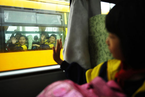 第一次坐上這種校巴的小學(xué)生們相互打招呼