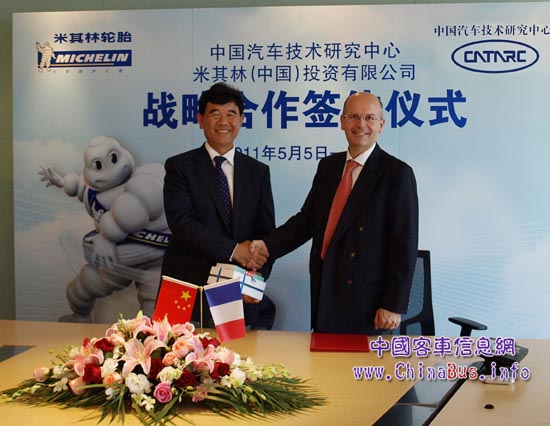 米其林(中國)投資有限公司與中國汽車技術(shù)研究中心宣布建立戰(zhàn)略合作關(guān)系,雙方將圍繞道路安全、環(huán)保、節(jié)能及其它雙方感興趣的研究領(lǐng)域開展深入合作。中國汽車技術(shù)研究中心主任趙航與米其林(中國)投資有限公司總裁夏逸夫(Yves Chapot)于5月5日在米其林中國總部簽署了戰(zhàn)略合作協(xié)議。來自中國汽車技術(shù)研究中心的其他領(lǐng)導與米其林中國的部分高管也出席了簽約儀式。