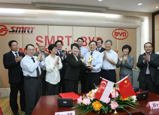 新加坡地鐵有限公司與比亞迪簽署合作諒解備忘錄 新加坡地鐵有限公司(SMRT)及旗下子公司SMRT國際客運有限公司,公布比亞迪股份有限公司與其簽署合作諒解備忘錄,SMRT國際客運有限公司。新加坡第一個多樣化運輸服務(wù)提供商,比亞迪是中國深圳一家基于尖端綠色能源技術(shù)的公司。以進一步討論關(guān)于成立合作公司來銷售電動汽車,如純電動、長續(xù)航里程的e6計程車和電動大巴。此次與比亞迪股份有限公司的合作是SMRT公司對環(huán)境可持續(xù)發(fā)展的綠色交通解決方案的一個很好的體現(xiàn)與證實。