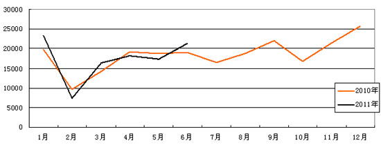 6月,中國客車統(tǒng)計(jì)信息網(wǎng)的50家客車企業(yè)共計(jì)銷售客車21376輛,同比增長12.43%,與前兩個月的負(fù)增長形成了明顯的反差,在6月份的強(qiáng)勢拉動之下,1-6月累計(jì)銷售客車103912輛,同比增幅有所放大,增幅上升到3.31%,比前5個月高出2.12個百分點(diǎn)。其中“一通三龍”銷量合計(jì)為50406輛,占客車總銷量的比重為48.51%,同比增長8.07%,是行業(yè)平均增幅的2.44倍。如圖所示,6月,客車銷量曲線突然上揚(yáng),暫時遏制住了4、5兩個月以來的下滑勢頭。