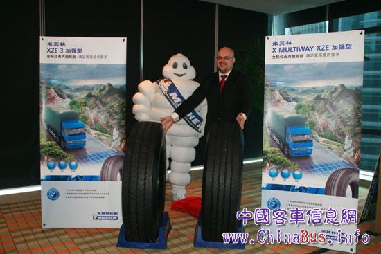 米其林(中國)投資有限公司卡客車輪胎部市場總監(jiān) 法蘭克葉先生與米其林輪胎先生共同為新產(chǎn)品揭幕