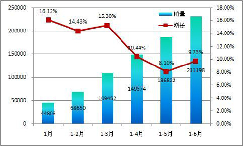 在上半年汽車市場整體增幅下滑的情況下,客車銷量增幅高于汽車總體銷量。6月份,汽車產銷數據轉負為正,同比微幅上漲,暫時遏制住了4、5兩個月以來的下滑勢頭。