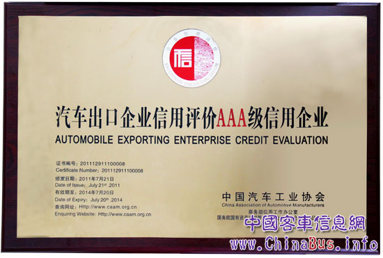 8月10日下午,由中國(guó)汽車工業(yè)協(xié)會(huì)主辦的“中國(guó)汽車出口企業(yè)信用評(píng)價(jià)頒證儀式”在北京舉行,大金龍首批獲得最高信用級(jí)別評(píng)價(jià)——AAA級(jí)信用評(píng)價(jià)。
