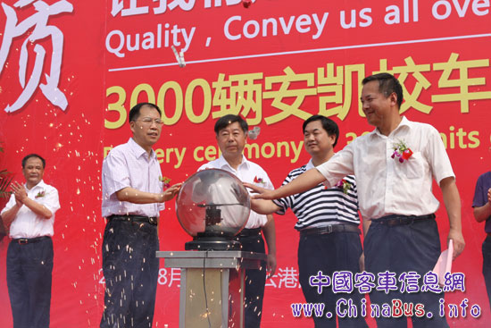 2011年8月15日上午,“品質(zhì)•讓我們走向世界”——3000輛安凱校車出口沙特發(fā)車儀式在美麗的濱海城市江蘇省連云港港口隆重舉行。來自安徽省商務(wù)廳、安徽安凱汽車股份有限公司、連云港港口集團(tuán)公司的相關(guān)領(lǐng)導(dǎo),以及包括新華社、中央電視臺、中國汽車報(bào)、中國工業(yè)報(bào)、安徽日報(bào)等在內(nèi)的全國50多家知名媒體一起,共同見證了中國客車出口的歷史性時(shí)刻。