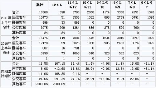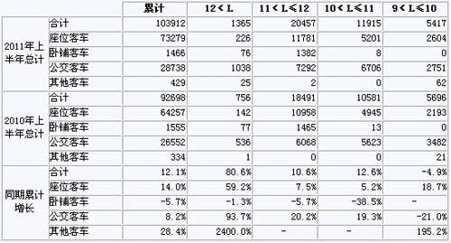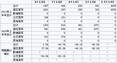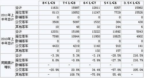 2011年上半年我國(guó)客車總體銷量呈增長(zhǎng)趨勢(shì),總體累計(jì)增長(zhǎng)12.1%,其中3.5<L≤5米增幅最大,達(dá)到216.5%。5<L≤6客車銷量下降幅度較大,8<L≤9與9<L≤10客車有小幅下降。除此之外,其他各米數(shù)段均有不同程度的增幅。
