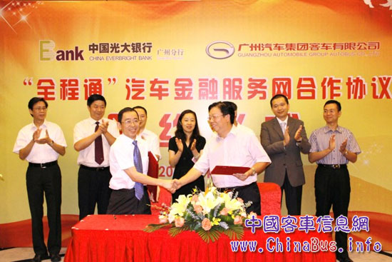 2011年7月20日上午,廣汽客車與光大銀行廣州分行在廣州麗卡酒店舉行了簡短而隆重的“全程通”汽車金融服務(wù)網(wǎng)合作的簽約儀式。廣汽集團(tuán)財(cái)務(wù)負(fù)責(zé)人王丹女士、光大銀行廣州分行行長陳凱慧先生等出席了儀式,并分別在儀式上致詞,表示希望借此良好的開端,實(shí)現(xiàn)全作各方的共贏。合作協(xié)議簽署完畢后,雙方交換了紀(jì)念品。