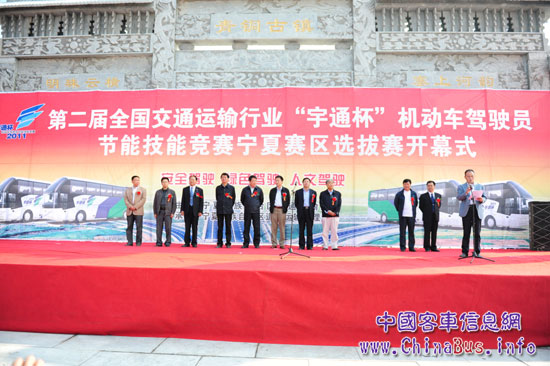 2011年9月26日,第二屆全國交通運輸行業(yè)“宇通杯”機動車駕駛員節(jié)能技能大賽第二站——寧夏站的賽事正式打響。本站活動選在了吳忠青銅峽鎮(zhèn)-商家灘一座古樸村落的廣場中舉行。寧夏回族自治區(qū)交通運輸廳副廳長楊有明,交通運輸管理局局長,吳忠市市長等領(lǐng)導(dǎo)出席了此次開幕式。協(xié)辦方鄭州宇通客車股份有限公司相關(guān)人員,和眾多媒體記者也出席了現(xiàn)場。當(dāng)天,有來自中衛(wèi)、固原、吳忠、石嘴山、銀川的五個汽運公司的30名駕駛員參加,為這片舊石器時代就有人類活動足跡的土地帶來了一番別樣的驚喜。