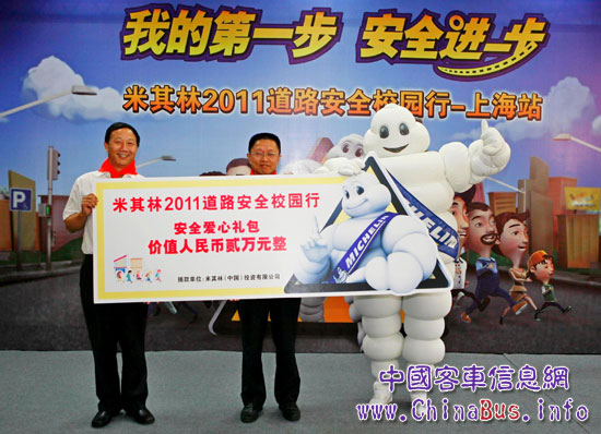 米其林(中國)投資有限公司副總裁王兆華、米其林輪胎先生向上海止園路小學(xué)校長房安榮捐贈(zèng)“我的第一步,安全進(jìn)一步”安全愛心禮包