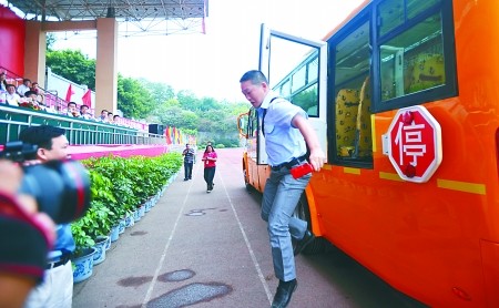 今后,當(dāng)你駕車看見印有學(xué)生圖案的黃色客車停下時,請你讓行莫超車,因為這是我市即將全面普及的校車。昨日,在我市安全校車現(xiàn)場會上,新校車露出真容。市安監(jiān)局局長肖健康說,校車擁有十大絕技,它不怕火、不怕翻、不怕爆、不怕撞。至于學(xué)生乘車的車費問題,肖健康表示,學(xué)生乘車有財政補貼,具體金額正在測算。