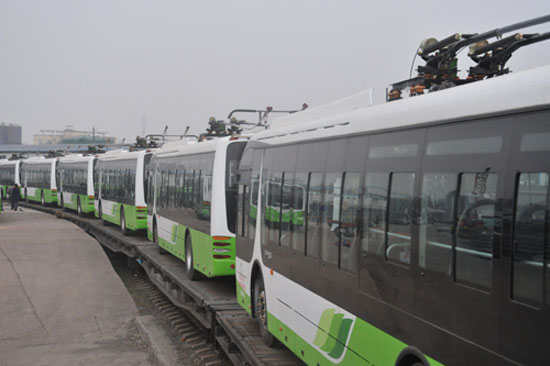 昨日,24輛整裝待發(fā)的揚子江新型雙源無軌電車,在舵落口火車站列隊緩緩駛上火車,發(fā)往太原。