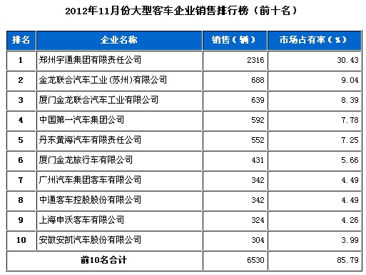 2012年11月大型客車企業(yè)銷售排行前十
