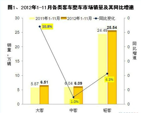 今年1-11月,各類客車市場都實現(xiàn)增長,其中以客車市場附加值最高的大客市場走勢最為強勁,銷量同比增長10.8%至6.51萬輛,而中客和輕客市場銷量分別實現(xiàn)1.0%和4.3%的增長。