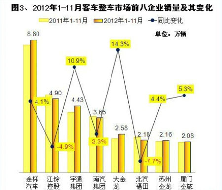 金杯汽車、蘇州金龍和廈門金旅銷量均以個位數(shù)增長,銷量分別增長4.1%、4.4%和5.3%。