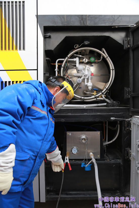 配圖:加氣站工作人員正在為福田歐輝雙層LNG公交加氣