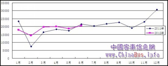 2012年6月,中國(guó)客車統(tǒng)計(jì)信息網(wǎng)50家企業(yè)共銷售各類客車20554輛,同比下降4.48%。1-6月,累計(jì)銷售客車111097輛,同比增長(zhǎng)6.39%(去年同期只有3.31%),其中,大型客車銷量36804輛,增長(zhǎng)8.56%,中型客車銷量36298輛,增長(zhǎng)8.82%,輕型客車銷量37995輛,同比增長(zhǎng)2.24%。只看數(shù)值,同比增幅還是較為理想的,但是,由于增幅的趨勢(shì)是從高到低的走勢(shì),因此,對(duì)下半年客車市場(chǎng)的表現(xiàn)將產(chǎn)生較大的壓力。