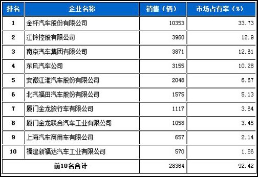2012年6月輕型客車企業(yè)銷售排行前十