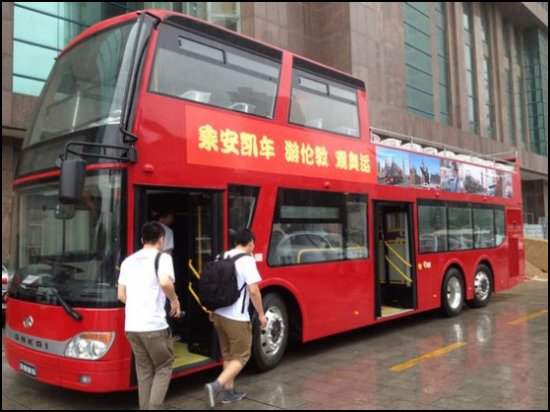 為了更真切地感受到安凱紅色敞篷巴士的魅力,安凱客車公司特地為參會代表舉行了試乘體驗(yàn)活動。上午,當(dāng)記者們坐上在雙層巴士后第一感覺就是舒適、大氣。據(jù)安凱客車公司的負(fù)責(zé)人介紹,巴士長11.9米、寬2.5米,高4.2米,上層有57個座位,下層加上輪椅區(qū)有26個座位,最高時速可以達(dá)到80公里。巴士分為上下兩層,上層為敞篷式車廂,為乘客提供了毫無阻礙的360度全景視野,帶給乘客們與眾不同的乘坐視覺體驗(yàn)。同時巴士還配備了中文、英語、德語、西班牙語、法語、意大利語、葡萄牙語和俄語等八國語音同步系統(tǒng),能夠同步翻譯多過語言,讓來自不同國家和地區(qū)的游客充分了解倫敦悠久的歷史文化、感受2012年倫敦奧運(yùn)的躍動氣息。