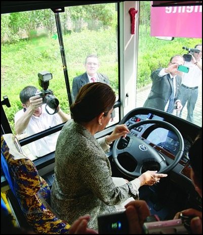 走出展廳,快步登上一輛嶄新的公交車,摸摸扶手,坐坐駕駛位,擺弄幾下方向盤,還按響喇叭……這是8月14日上午發(fā)生在蘇州金龍海格客車公司內(nèi)的一幕。該款公交車不久將批量出口到哥斯達(dá)黎加,而來訪的該國女總統(tǒng)欽奇利亞則饒有興致地客串了一把 “驗車員”。當(dāng)天,在蘇州訪問的短短三個小時里,哥斯達(dá)黎加總統(tǒng)欽奇利亞一行專門安排時間來到海格參觀訪問。